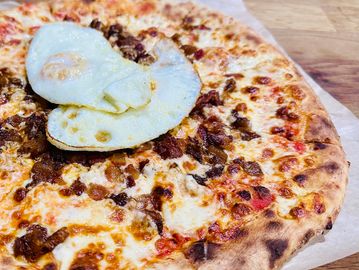 marinara, mozzarella, crumbled bacon, seasoned potatoes, and sunny side up eggs